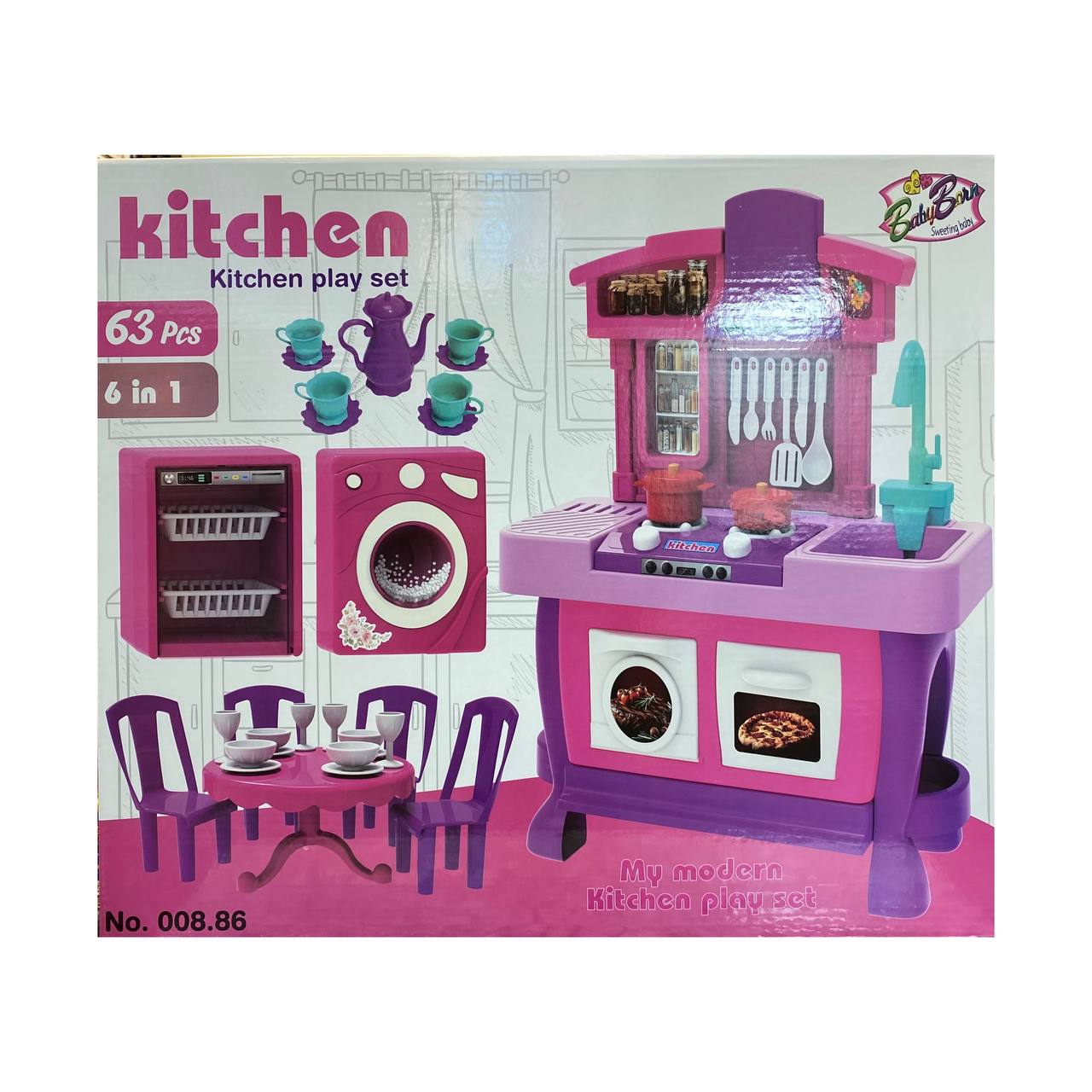 این مجموعه شامل 63 قطعه مختلف است که به کودکان امکان می دهد تا در دنیای شگفت انگیز پخت و پز و سرگرمی شیرجه بزنند. این آشپزخانه با طراحی زیبا و رنگ های جذاب، مناسب برای سنین 3 سال و بالاتر است.